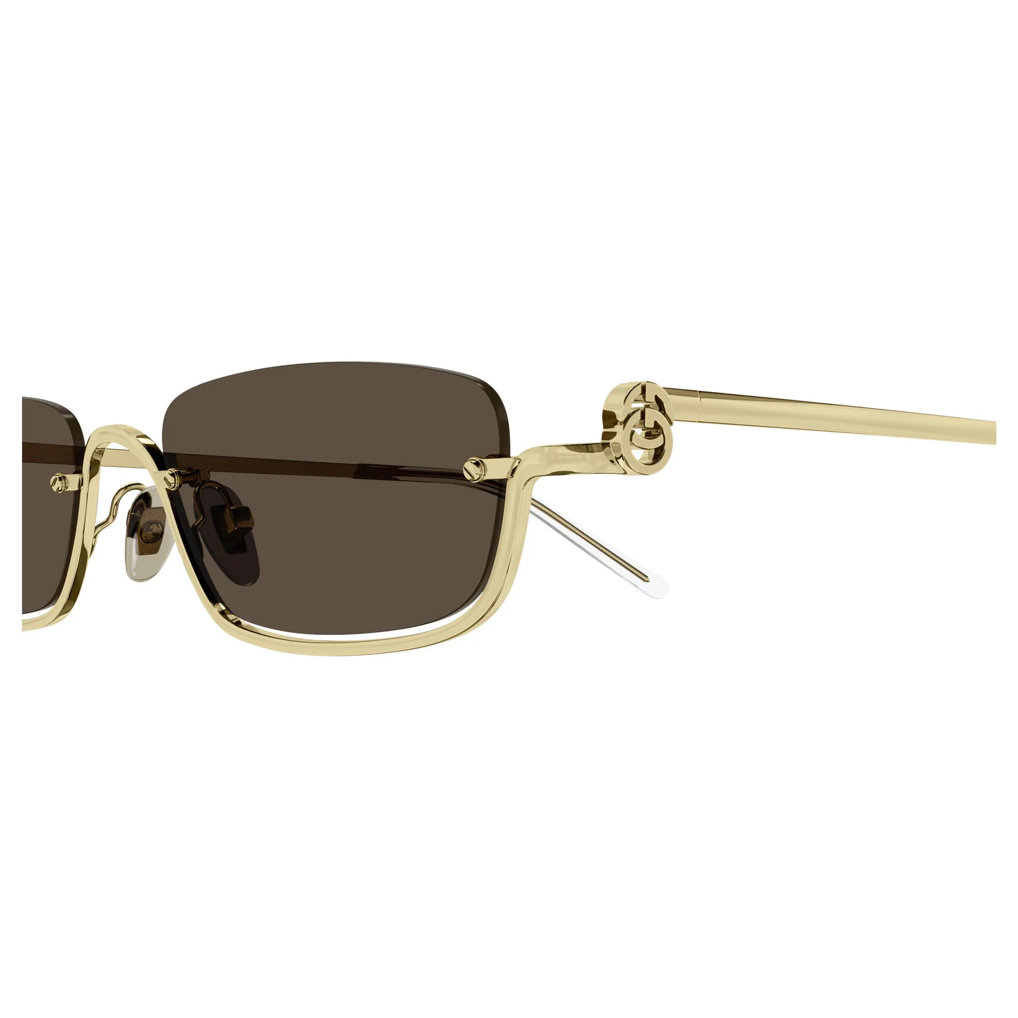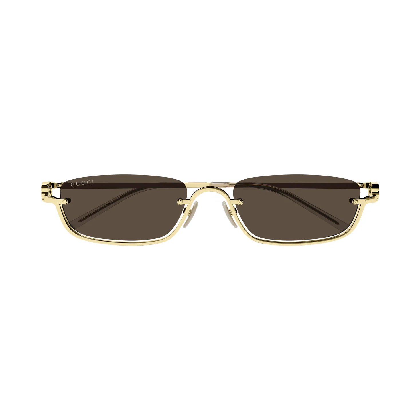 Los lentes en tono marrón clásico ofrecen protección UV categoría 3, perfectos para uso diario, conducción y actividades al aire libre. Su estructura ligera y varillas estilizadas garantizan comodidad durante todo el día, mientras que los detalles grabados y el logo Gucci en las patillas refuerzan su carácter exclusivo.